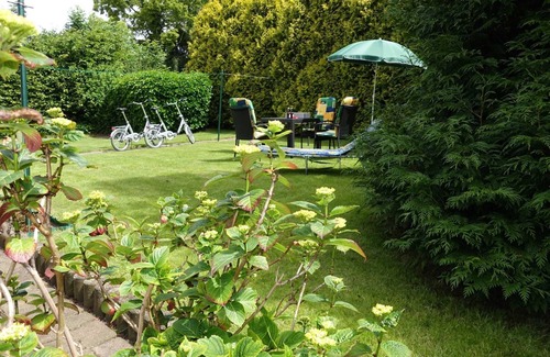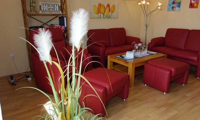 Decorated in fresh colors, the apartment Heike is located in 1. First floor of a house renovated in 2016 and has a separate entrance. The highlight of the open-plan living and dining area is the chic seating area in red leather, which invites you to relaxed and cozy moments. Adjacent the balcony facing south with a small seating corner for the cup of coffee in the morning or the glass of wine in the evening. In the separate, well-equipped kitchen can be provided for the physical well-being. We continue to the cozy bedrooms, which promise deep sleep and pleasant dreams. One bedroom has two single beds that can be put together or shared as required. The other bedroom has a double bed measuring 140x200 cm. The shower bath in bright, clear colors motivates to a fresh start to the day. In the whole apartment is the flooring in bright laminate. For sunbathing, sunbathing, barbecue and more invite the seating corner in the garden and on the front terrace. There is a possibility to store bicycles and a car park in front of the house.