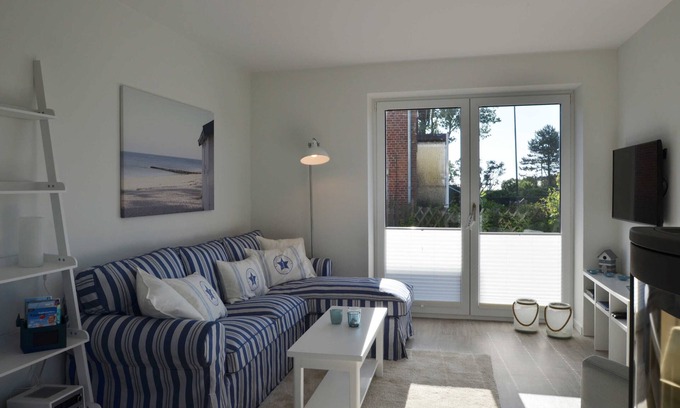 The reference to the lake can be clearly seen in the apartment Skagen on the ground floor. The interior is decorated in maritime style in the colors white and blue and is complemented by selected accessories from GreenGate. Two bedrooms, a shower-bath, a guest toilet, washer and dryer and a terrace with fenced garden area make this apartment your perfect holiday home right on the Baltic Sea coast. The living room with white solid wood dining table and stove and its large, floor-to-ceiling windows let in plenty of light and also allows a beautiful view of the garden. The open-plan fitted kitchen offers ideal conditions to enjoy socializing while you cook. The fenced garden area with generous south-east terrace is perfect for relaxing and unwinding. Dogs are welcome in this apartment.