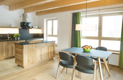 Reopening 2017! The apartment has been lovingly decorated with handmade wooden furniture and natural materials in a modern Alpine style. Relax in your own Physiotherm infrared cabin or on the spacious south-west balcony. For a restful sleep, we have blankets made of natural fiber (Tencel) and a selection of different pillows (eg. Stone pine or allergic pillows) ready for you.