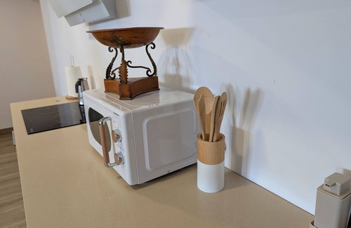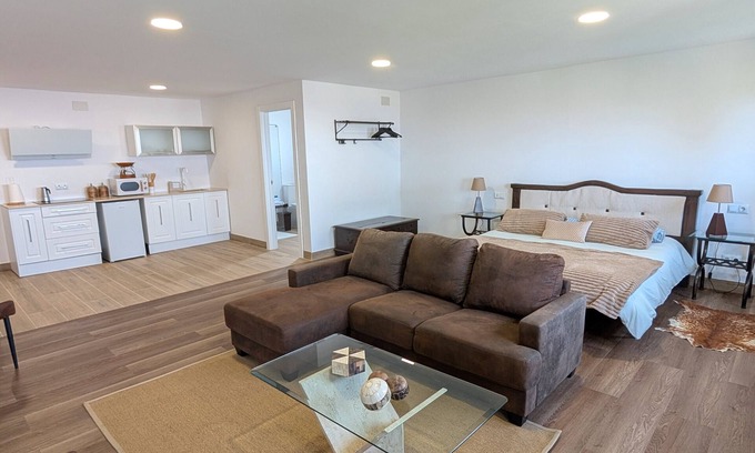 Wake up to sweeping vistas over the lush hills of Arucas and the distant Atlantic, perfectly framed by your bedroom window. This spacious, open-plan loft blends warm wooden floors and rustic touches with modern comfort. The queen-size bed invites long, relaxing mornings, while the cozy sofa offers a comfortable spot to unwind after a day of exploring. The kitchen is equipped with all the essentials for preparing your favorite meals, and the modern bathroom features a spacious walk-in shower for a refreshing start or relaxing end to your day. Ideal for couples or solo travelers seeking a peaceful base close to Gran Canaria’s nature and culture.
