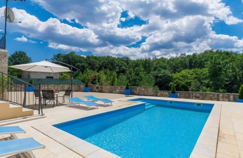 Frankovići 10 km from Motovun: Single-family house "Šterna", 2 storeys. In the hamlet Frankovići 8 km from the centre of Pazin, 30 km from the sea, in the countryside. Private: property 300 m2 (fenced), swimming pool angular (7 x 3 m, 24 m2, depth 140 cm, seasonal availability: 20.Apr. - 30.Sep.) with internal staircase. Shower/WC in the pool area, terrace, barbecue. In the house: internet access, table football, washing machine. Parking at the house on the premises. Shop 3 km, restaurant 3 km, bus stop 5 km, pebble beach 30 km. Please note: animals in the neighbourhood. Village with farms and domestic animals.
