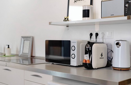 - Kitchen: The kitchen is equipped with a four-ring induction hob, a microwave and a small fridge. It also has a table for four people, ideal for enjoying meals in company.