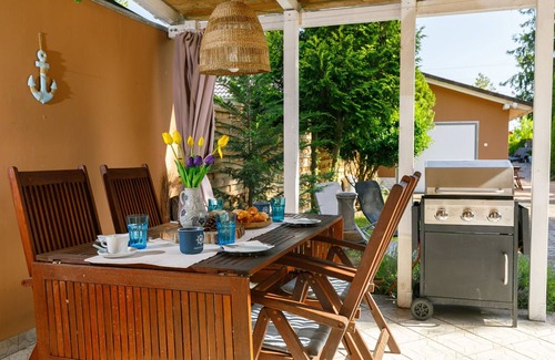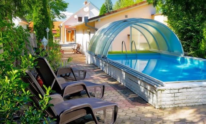 Balatonmária 23 km from Keszthely: Comfortable house "Chill". In a sunny position, 150 m from the lake, 600 m from the beach. Private: garden 400 m2 (fenced), swimming pool angular (3 x 7 m, depth 160 cm, seasonal availability: 01.May. and 15.Sep.) with internal staircase and shutter cover. In the house: WiFi, air conditioning. Parking on the premises. Grocery, restaurant 200 m, bakery 2 km, railway station 300 m, grass beach 500 m, outdoor swimming pool, thermal baths "Hévíz" 25 km. Surf school 6 km, sailing school 6 km, tennis 3 km, riding stable 700 m, cycle lane 100 m, children's playground 2 km. Nearby attractions: Kis-Balaton Visitor Centre 17 km, Kristinus Vineyard 11 km, Bobo Fun Park 28 km, Festetics Csstle 20 km, Hévíz Thermal Bath 24 km. Please note: railway line closeby.