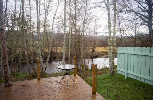 Bearnock, Loch Ness 10 km from Drumnadrochit: Modern, comfortable chalet "Glen", detached, built in 2023. 9 houses in the resort. In a quiet position, 5 m from the river. In the house: central heating system. Parking. Shop 10 km, grocery 10 km, supermarket 10 km, restaurant 3 km, bicycle rental 6 km, bus stop 400 m, railway station "Inverness" 35 km. Golf course (18 hole) 30 km, riding stable 10 km. Nearby attractions: Urquhart Castle 12 km, Glen Affric 17 km, Fort Augustus 40 km, Kyle Of Lochalsh - Isle of Skye 110 km. Well-known lakes can easily be reached: Loch Ness 12 km. Hiking paths: Great Glen Way. Please note: car recommended.