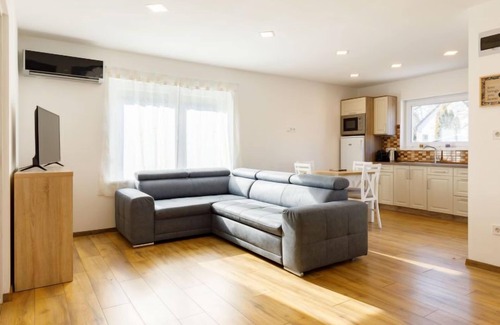 Balatonkeresztúr 22 km from Keszthely: Beautiful, comfortable house "Honey", built in 2022. In the resort, 600 m from the lake, 400 m from the beach. Private: property (fenced), lawn for sunbathing. Terrace. In the house: WiFi, air conditioning, washing machine, tumble dryer. Parking (for 2 cars) at the house. Grocery 150 m, supermarket 5 km, restaurant 500 m, bar 900 m, bakery 900 m, bicycle rental 5 km, railway station 3 km, grass beach 300 m, thermal baths "Csiszta" 17 km. Surf school 6 km, sailing school 6 km, tennis 3 km, riding stable 150 m, cycle lane 200 m, children's playground 800 m, fishing possibilities 300 m. Nearby attractions: Hévíz Thermal Bath 20 km, Festetics Palace 20 km, Rubin Winery 5 km, Airport 2 km, Somoshegyi Viewpoint 7 km, Siófok - Ferris Wheels 62 km.