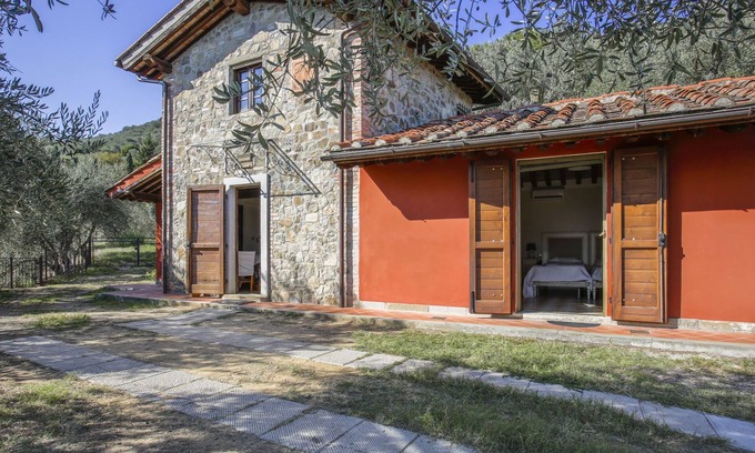Beautiful, rustic, comfortable country house "Iacopo", 150 m a.s.l surrounded by trees and fields. 4 km from the centre of Montecatini Terme, 30 km from the centre of Lucca, 50 km from the centre of Firenze, in a secluded, sunny position on a slope, 55 km from the sea, in the countryside. For shared use: table tennis. Private: large terraced garden, 2 ha with wildlife garden and trees, natural garden, swimming pool fenced (9 x 4 m, depth 110 - 150 cm, seasonal availability: 25.Apr. - 15.Oct.). Outdoor shower, patio, terrace, garden furniture, pool maintenance by the owner/gardener. In the complex: sauna, steam room, hot tub (all extra). 400 m long narrow motor access (200 m via unmade road). Parking on the premises. Grocery 600 m, supermarket 1.5 km, restaurant 200 m, bus stop 3 km, railway station "Montecatini Terme" 4 km, sandy beach "Lido di Camaiore" 55 km. Golf course (18 hole) 10 km. Local sale of farm products. Attention: The Spa is located in the farmhouse at about 300 m. Restaurant at the farmhouse open one day a week.