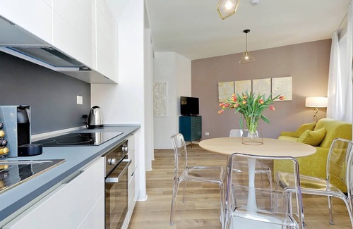 The kitchenette has a refridgerator, dishwasher, induction hob, oven, microwave, toaster, electric boiler, coffee machine (Nespresso), cutlery and crockery for six persons. A table with 4 chairs completes the kitchen and living area.