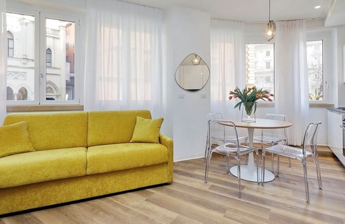 Welcoming and functional 45 sqm two-room apartment located on the 1st floor (with two elevators) , openspace with living and dining room and kitchenette, a bedroom and a bathroom. The heating and air conditioning system is centralized with ceiling fan coils with an individual room thermostat.The building was built in 1949 and designed by the Architect Angelo di Castro and was totally renovated in late 2019. The architectural particularity and a careful choice of furniture highlights its brightness and modernism .