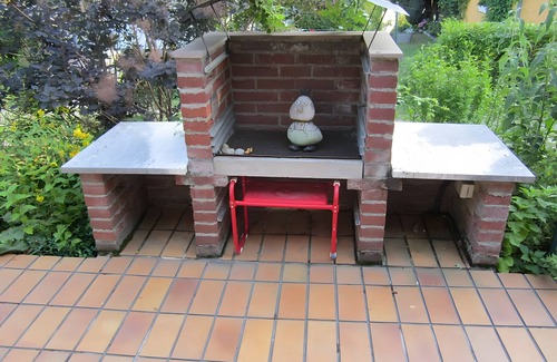 This vacation home features a private outdoor space with a garden, open and covered terraces, and a barbecue.