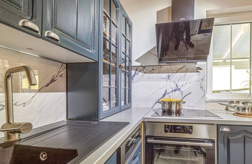Spread over a single floor, this modern, one-bedroom apartment is air-conditioned for pleasant year-round stays. The living room of the house is elegantly designed with a big L-shaped sofa and a Smart-TV to kick back and relax as if in your own home. In the attached area, there is indoor dining for up to 6 guests and a well-equipped kitchen for a carefree stay. Kitchen utilities include a microwave, induction hob, oven, fridge, and toaster, among others.
