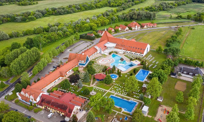 Kehidakustány 21 km from Keszthely: Mums, dads, kids and grandparents can enjoy the thermal Kehida all year round! beautiful, cosy resort, built in 2005. 15 houses in the resort. Outside the resort, in a quiet, sunny position, 300 m from the lake, in a cul-de-sac. For shared use: garden (not fenced) with plants, swimming pool (above ground) indoor pool heated (seasonal availability: 01.Jan. - 31.Dec.). WC in the pool area, shower/WC in the pool area, children's pool, slide, outdoor shower, hot tub, children's playground (sandbox). In the complex: reception, restaurant, bar, breakfast room, WiFi, sauna, fitness room, massage (extra). Steam room, solarium (extra). Hot tub, infrared sauna, bicycles available. Linen change weekly. Towel change 2 times per week. Room cleaning 2 times per week. Breakfast and half board possible (extra). Supermarket 8 km, shopping centre 11 km, restaurant, café 100 m, bicycle rental 100 m, indoor swimming pool 150 m, thermal baths 150 m, bathing lake "Balaton" 21 km. Golf course (9 hole) 1.5 km, children's playground 150 m. Well-known lakes can easily be reached: Hévíz 8 km. Please note: entertainment. Suitable for families, baby equipment on request. please note: free entry to the water park, treatment bath, beach and sauna.