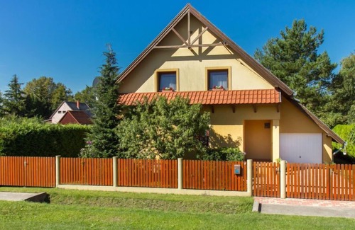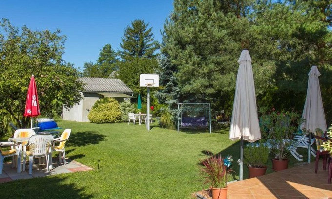 Balatonkeresztúr: Cosy single-family house "Maggio", 2 storeys. In the resort, in a quiet position, 800 m from the lake. Private: beautiful, well-kept garden 600 m2 (fenced), lawn for sunbathing, swimming pool (above ground) (seasonal availability: 15.May. - 15.Sep.). Basketball. In the house: air conditioning (extra). Grocery 800 m, restaurant 150 m, grass beach 800 m.