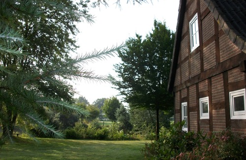 The complex consists of 2 cottages on a quiet 18th 000 square meters, fenced plot. The "Bickbeerhütte" can accommodate 2 to 4 people. the "packing shed" for 2 to 6 people. Dogs are welcome guests. The Häuer were once manager house and packing shed of a blueberry plantation. The rest of the plantation on the property is at the guest's free disposal, harvest time from late July to early September. Depending on the number of people you will be assigned the Bickbeer hut or the pack shed. The property is always rented to 1 tenant at the time. On the property there is also a 800 square meter large bathing pond with dock and swim ladder. The coast, Holland, Bad Zwischenahn, Oldenburg, Bremen or Leer can be reached within an hour by car. On a well-developed, signposted cycling paths can parkland Ammerland know.