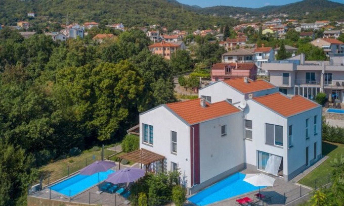 Pobri: Single-family house "Races", 3 storeys, built in 2017. Above Opatija 2.5 km from the centre of Opatija, in a quiet, sunny position, 2.5 km from the sea, 2.5 km from the beach, in a cul-de-sac. Private: property 1'000 m2 (fenced), lawn 200 m2, swimming pool angular (7 x 4 m, 30 m2, depth 140 cm, seasonal availability: 01.May. - 15.Oct.). Outdoor shower, hot tub, terrace (12 m2), garden furniture, barbecue. In the house: internet access, billiard table, table football, washing machine. Parking (for 5 cars) at the house on the premises. Shop 150 m, restaurant 2.5 km, bus stop 63 m, pebble beach 2.5 km, public bathing area 2.5 km, concrete beach 2.5 km. Youth groups are not allowed. Organizing a party is not allowed.Hot tub heating extra in the period 15.10.-01.05 in other periods included in the price. The unit consists of 2 houses rented as one unit. Private: terrace 12 m2, outdoor kitchen (4 hot plates, fridge), swimming pool (35 m2, depth 140 cm, 01.05.-15.10.). Unconventional pool shape.
