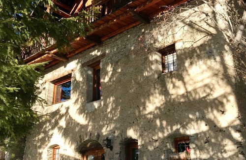 Old Grange is an enchanting six village chalets, across the Susa valley, in the heart of The Milky Way. In the 18th century, it was rebuilt in 1975 in the traditional style of the valley, stone for the bottom and wood for the top; located in a position boasting the finest views of the valley, encompassing the Gran Roc massif and the Chaberton peak. In this magnificent setting, the village is for pedestrians only. The Grange Vecchie with the center of Sestrieres - the famous for its miles of skyruns (the Vialattea) and the 2006 Winter Olympics for the Alpine Specialties. This particular Grangia is the only one that features an original piece: the kitchen where a stone is in the corner bears the inscription: 1714. The old house with its two sloping rooftops and a larch tympanum may seem to be standing in front of a paved road. The front of the stone, the original iron and wood doors, is particularly attractive in the summer, when the blossoming mountain flowers soften the sever look of the stone, making the prospect of outdoor dining at a rustic corner table very inviting. The interior is composed of three floors, is by no means ostentatious, its beauty plays on the natural contrast between the rough plaster and the wood wall. The five floors are composed by the kitchen, with a table that seats 5 guests, 2 fridges, a six fires stove, oven and dishwasher. a dining room that seats 12 people and is adorned with menus of famous restaurants; a bedroom with a king bed that is located five feet from the floor - with a baby bed underneath; a cupboard, a bathroom with shower. On the outside there is a garden with a table in the summer or on a sunny day; the view is opened on the sunny Sauze of Cesana valley and the Chaberton Peak. The middle floor is one of the entrance halls; a pantry for sky boots and coats; a big living room with sofas and seats near the big fireplace and at 50 "Plasma TV, Skybox; a twin beds bedroom plus one that slides between them and cupboard; a bathroom with bath. The atmosphere created by the typical pieces of mountains. From the entrance hall It is composed of a master bedroom with canopy bed and cupboards embellished with carvings made with traditional valley craftsmanship; a bedroom with a king bed and a single bed; a bathroom with bath. There is a wooden balcony outside the Master bedroom.