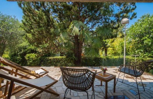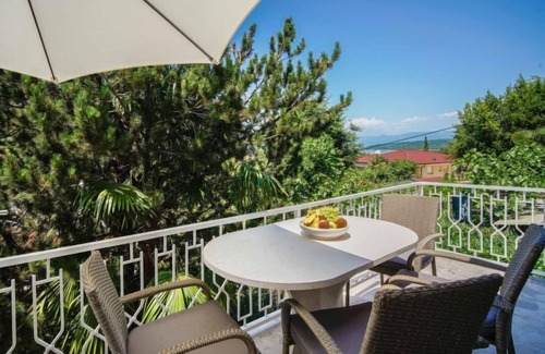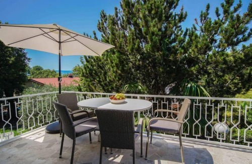 Semi-detached house "Vesna", 2 storeys, surrounded by trees. 700 m from the centre, in a quiet, elevated position, 120 m from the sea, 120 m from the beach, in the countryside, south facing position. Private: property (fenced) with wildlife garden and trees, natural garden. Outdoor shower, barbecue. In the house: internet access. Parking at the house on the premises. Shop, restaurant 700 m, café 400 m, bus stop 500 m, pebble beach 400 m, rocky beach 120 m, public bathing area 400 m.