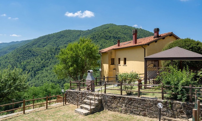 5-room house 180 m2 on 2 levels. Comfortable and beautiful furnishings: living/dining room with open-hearth fireplace, dining table, satellite TV and DVD. 2 rooms, each room with 1 french bed (160 cm). Open kitchen (oven, dishwasher, 5 gas rings, toaster, kettle, microwave, freezer, electric coffee machine). 2 showers/bidet/WC. Upper floor: with sloping ceilings, 1 open room with 1 double sofabed. 1 room with sloping ceilings with 1 french bed (160 cm), shower/bidet/WC. (spiral staircase), 1 room with sloping ceilings with 2 beds and shower/bidet/WC. Oil heating. Patio roofed, garden 500 m2. Barbecue, deck chairs (10). Panoramic view. Facilities: washing machine, children's high chair, baby cot for up to 2 year olds, hair dryer. Internet (WiFi, free). Parking at the house. Please note: non-smoking house. Maximum 1 pet/ dog allowed. IT048013B5N8E5D2HM