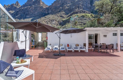 The holiday home Vv Pedacito de Cielo, which is situated in San Bartolomé de Tirajana, overlooks the nearby mountain. The 150 m² property consists of a living room with a sofa bed for one person, a fully-equipped kitchen, 2 bedrooms and 1 bathroom and can therefore accommodate 8 people. Additional amenities include high-speed Wi-Fi (suitable for video calls), a TV, air conditioning, a washing machine as well as children's books and toys. Crib and high chair available upon request to the property. This vacation rental features a private outdoor pool, a spacious garden, 2 covered terraces, an open terrace, and a barbecue. Enjoy the perfect outdoor setting for your vacation getaway.