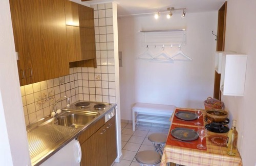 "Valdor A 42 Sud", 1-room studio 32 m2, on the ground floor, south-west facing position. Simple and comfortable furnishings: living room with 1 sofabed (140 cm, length 190 cm), dining table, cable TV, flat screen, radio, CD-player and DVD. Exit to the garden, to the terrace, south-west facing position. Kitchenette (2 hot plates, toaster, kettle, electric coffee machine, Capsules for coffee machine (Dolce Gusto) extra, raclette grill, combination microwave, fondue Set (chinoise, cheese)). Bath/WC. Large terrace, lawn. Terrace furniture, electric barbecue, deck chairs (2). Distant view of the mountains. Facilities: iron, hair dryer. Internet (WiFi, free). Please note: non-smokers only.