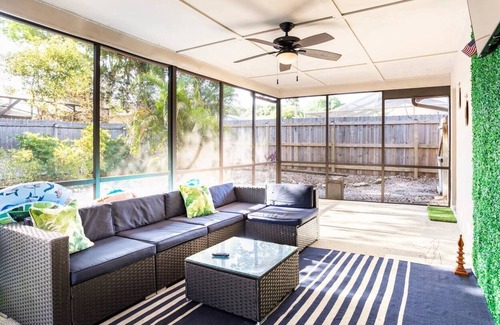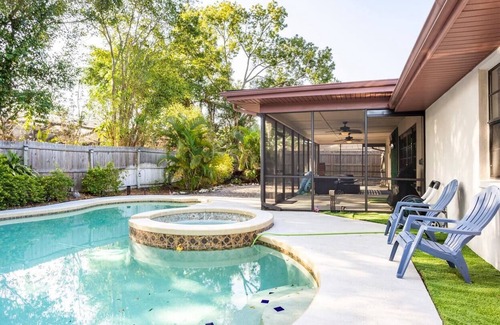 Welcome to Valencia Manor a luxury vacation home where you can relax and enjoy Florida sunshine. Property features 3 bedrooms and 2 full bathrooms, spacious and bright open concept living room/ dining room, smart 4K TVs, WiFi, roomy kitchen with breakfast table, all stainless steel appliances, coffee/latte/cappuccino station, fully stacked kitchen, silverware and plates for 8 guest, a screened in patio, in-ground swimming pool (4ft-8ft), and a jetted spa that overflows to the pool, and more