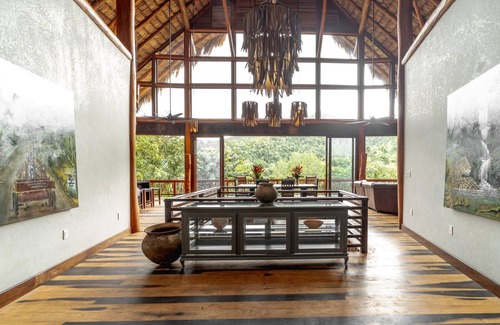 Perched high over a gently flowing stream and next to a small post card waterfall, the luxurious 5,000 square foot home blends in with nature and the surrounding beauty. From the minute you walk across the bridge into the front door you are greeted with amazing views of the surrounding Maya Mountains and the stream below. The soaring 30 foot high ceilings made from native thatch and rich Belizean hard wood floors make the views inside as amazing as the view outside. The all rock pool and hot tub perched over the cliffs edge make for the ideal spot to relax and take in the amazing sights and sounds of the rainforest. The home has two beautiful private master suites located on the first floor as well as a large study with full bath that could also be used as a kids bedroom.