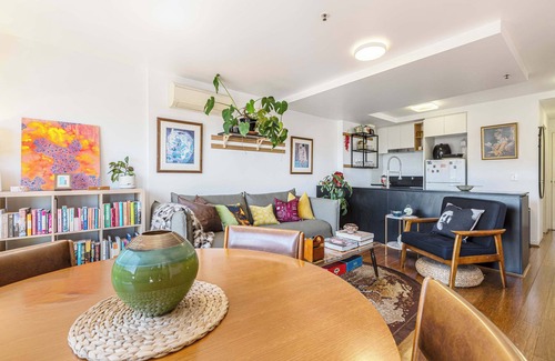 Both bedrooms feature queen beds, blackout blinds, ambient lighting and wardrobe space. Textures are layered, tones are earthy, and thoughtful touches bring personality and calm. Double glazing throughout ensures comfort, even in the buzz of the inner north.