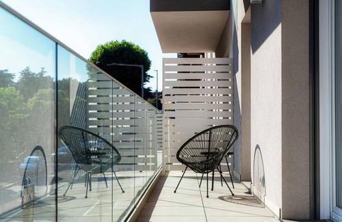 The flat has a balcony furnished with a small table and a deckchair, ideal for relaxing in the fresh air.