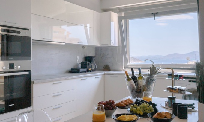 In a prime location near the cosmopolitan beach of Varkiza resort and only 20 minutes from Athens International Airport (via the shuttle service we provide by booking), the luxurious apartment of 80 sq.m. (for up to 5 persons) with panoramic sea view is the ideal base for exploring the Athenian Riviera for families and groups.