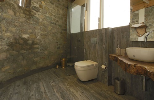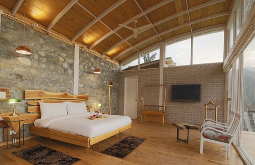 This awesome bedroom, with specially commissioned art, offers spectacular views of the Ramgarh valley. Wooden flooring, pine wood Queen bed, stone tiled attached bath, each accent in this room spells class.