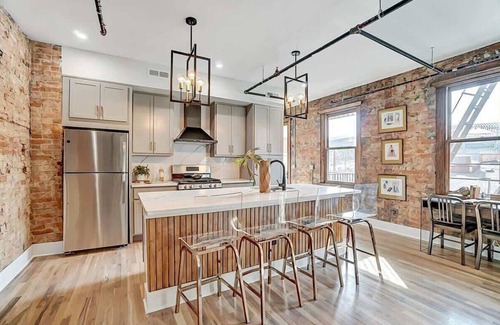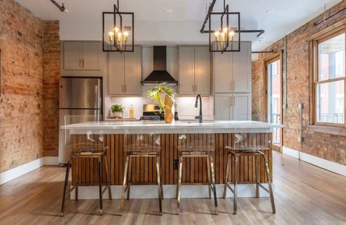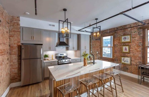 The condo is open concept with a large open kitchen/living room with a large quartz island, stainless steel appliances, dishwasher, gas stove, modern lighting, and plenty of space to entertain or relax! Exposed brick walls keep the historical perspective with modern conveniences all around you. The unit is outfitted with brand new, modern furniture from West Elm, Crate & Barrel and CB2 and amazing artwork. The kitchen comes complete with an ice maker and Nespresso coffee bar. For sleeping, the master bedroom has a king-sized bed and the living room couch easily transforms into a futon.