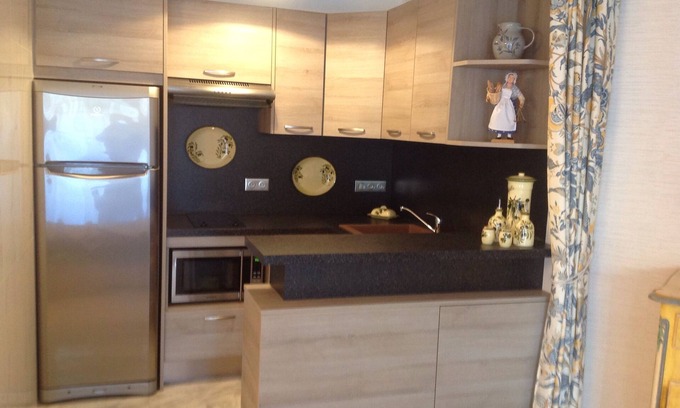 American kitchen with bar. New elements and furniture: large fridge-freezer, electric extractor, ceramic hob, multifunction oven / microwave, washing machine. Crockery and cookware complete with all the essential equipment.