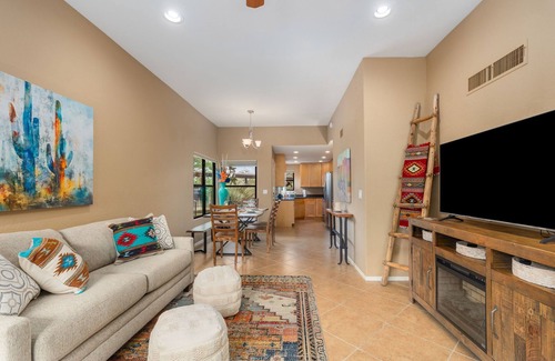 Casita with one shared side wall and no unit above. Two bedroom, one king and one queen, two bath with queen sleeper sofa sleeps six. Lighted four steps down with handrail from parking to a level unit. All new furniture, Serta iComforteco mattresses, bedding, kitchen ware, bathroom towels, TV, etc... Everything is brand new. In unit washer and dryer. Air conditioning, electric fireplace. WIFI with 300 mbs can be upgraded to 500 or 1000 for an additional fee. Enclosed patio with table and four chairs with a beautiful view of the Catalina Mountains. Carport is right next to the unit and lighted. Plus one additional uncovered parking space. Loews Ventana Canyon Resort 1 mile away. Hiking and biking in nearby Ventana and Sabino Canyons. Shopping and restaurants 1/2 mile away. Access to community pools, hot tubs, bbq grill and exercise facilities within development. Far removed from the main road this unit very quiet. Grounds have beautiful and very well maintained landscaping.