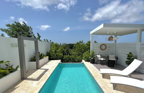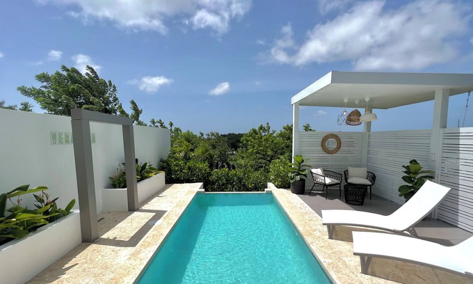 Private apartment for short-term rent. Exclusively for adults and specially designed for couples. With direct access to a totally private infinity pool with heater, outdoor shower, panoramic view from the bed, and outdoor night cinema. A unique space, in a half container (interior space of approximately 160 square feet) at Aguadilla.