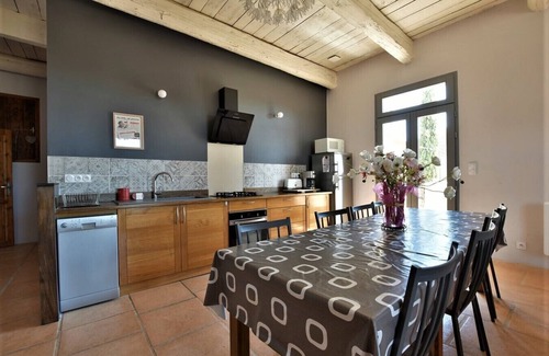 The cottage is located on the Mas floor and accessible by an independent entrance (opposite the owners' living space). With a surface of 180 m², to which must be added an open terrace of 80 m², it is designed, rented as a whole, for groups of up to 10 people. The gite is composed of an entrance, a very large living room (kitchen, dining room, living room) opening onto the terrace (with barbecue), a second living room, 4 bedrooms and 3 bathrooms / WC.