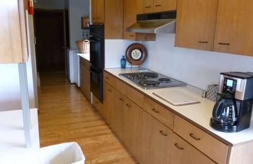 The kitchen is large, with over & under ovens, electric 4-burner cook top, microwave, refrigerator/ freezer, & dishwasher. The connected breakfast area easily seats 8 and has a wood-burning fireplace. The dining table (in Great Room) seats 10. There is a pass-through counter/bar between the kitchen & dining area.
