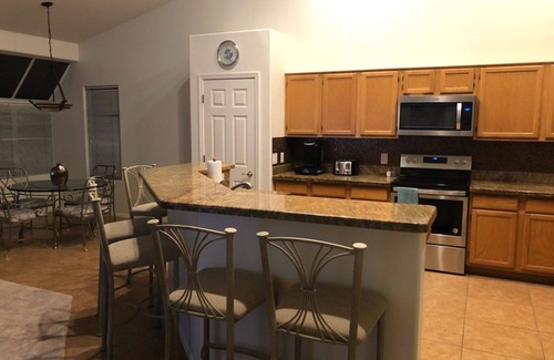 Very clean and in excellent condition. Kitchen fully equipped with new stainless steel appliances and dinner/cook ware and utensils. Near casinos, outlet shopping and close to retail centers and the Chandler Mall. Also close to several top golf courses, such as the Legacy and Whirlwind courses Cattail and Devils Claw, as well as the Raven Phoenix, to name a few. The property has 5 beds, one king in the Master, two queens and two twin beds. All rooms include TV's and WiFi. Family games and movies provided. We also have 2 sofa beds available if needed for the potential to sleep up to 10 family members and friends. BBQ in backyard.