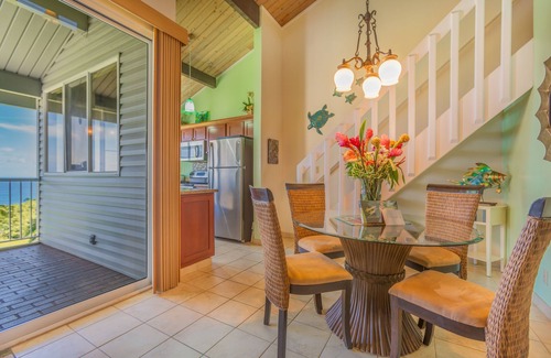 Master bedroom with ensuite walk in shower has a lovely, very private, lanai surrounded by tropical trees inhabited by birds who serenade you each morning. There is a second bath in the living area and two queen beds in the upstairs loft. A new sofa bed in the living room provides another sleeping option. Very comfortable for 4-6 guests.