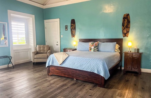 This marvelous 3rd floor unit makes guests feel like they are in the clouds. With views of the Caribbean Sea, amazing sunsets, Frederiksted town and the hills behind, you won’t want to leave. The Pier, famous for its snorkeling and diving, is steps away, tempting you to enjoy its vast ecosystem. Mermaid's amenities include a king-sized bed, minifridge, microwave, coffee maker, a large bathroom with a walk-in shower, AC, TV, Wi-Fi, ceiling fans, and a wrap-around gallery deck with outdoor seating for west, south, and east views. A queen- sized sleeper sofa adds more sleeping options to the room. This room can also be adjoined to The Turtle to create one of the best two-bedroom suites on the West End.