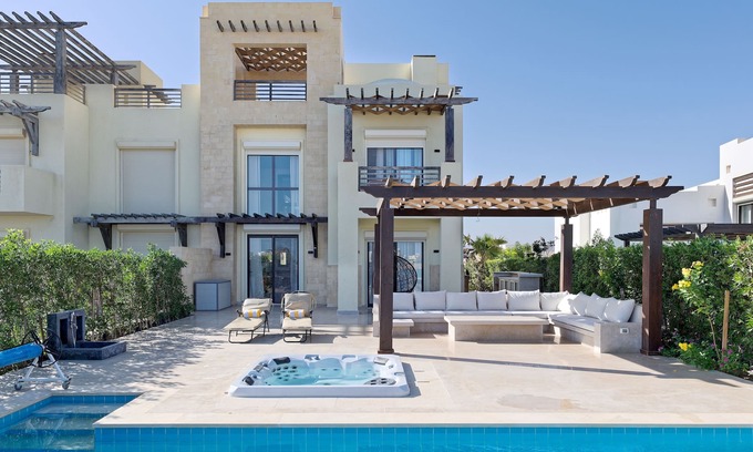 Villa ASV-81 is located in El Gouna Ancient Sands area. A very relaxing theme that comes with a private heated pool and a private Jacuzzi, is comprising the main premise of the villa. Guests enjoy our hotel services of housekeeping every 2 days, room service, Netflix and free Wi-Fi.