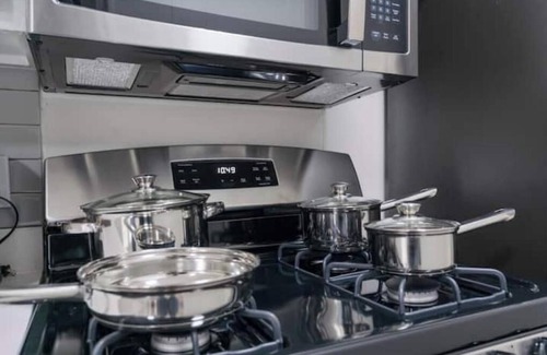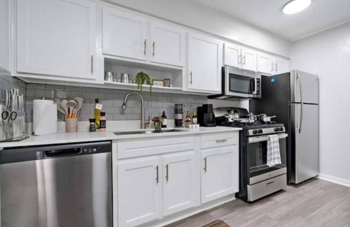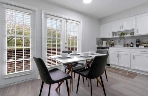 Stay with us and wake up on your comfy king-size gel memory foam mattress in our lux apt just minutes from downtown Austin! Enjoy dinner in the dining area or complimentary coffee/tea on your private balcony. An office space with a balcony view and modern kitchen amenities catered to your needs. Gather around stainless-steel appliances and spacious countertops. Your perfect Austin stay starts here!