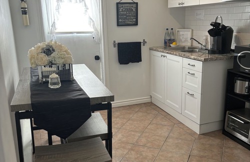 Within you’ll find a beautifully furnished living room with a 2-seater couch, along with 2 poufs, a vintage bluetooth record player, a workstation and an inviting ambience. The unit comes with complimentary WiFi, a projector to connect your own devices, and/or you can log into the Roku using your own personal account info ( Netflix, crave, prime etc)