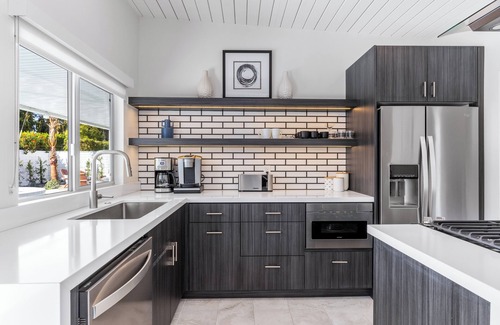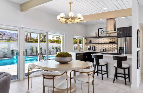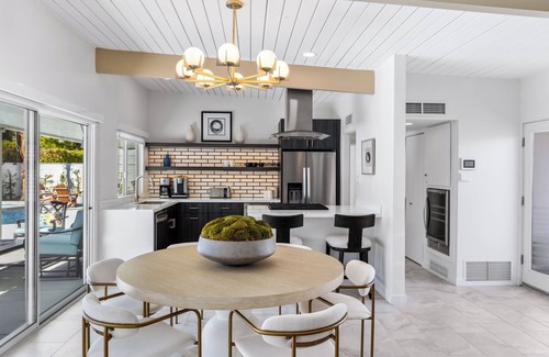 Step inside to discover a thoughtfully designed great room that perfectly captures the essence of Palm Springs living. Exposed beam ceilings stretch across the room, enhancing the sense of space, while a sleek fireplace adds warmth and style. Floor-to-ceiling windows flood the area with natural light, seamlessly blending the indoors with the outdoor beauty. Mid-century furnishings, modern accents, and vibrant artwork create a welcoming atmosphere that’s as sophisticated as it is comfortable. The open-concept layout connects the living, dining, and kitchen areas, making it the ultimate gathering space. The kitchen is a dream, featuring high-end stainless steel appliances, stylish cabinetry, and a breakfast bar ideal for casual bites, morning coffee, or evening cocktails.