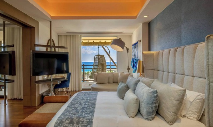 Savor delightful culinary experiences at the resort's restaurants, where you can indulge in mouthwatering dishes, including traditional Mexican cuisine served right on the beach with an enchanting Day of the Dead theme and artistic décor that delights all the senses. For a casual outing, visit our lively bar, featuring a unique outdoor space under a stunning palapa roof and a charming vintage “Street-Snacks” van serving up delightful light bites and refreshing drinks. Below the van, discover a sandy floor area complete with swing chairs, ping-pong, and foosball tables, perfect for embracing the cheerful summer spirit.