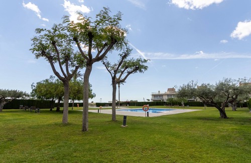 L'Ampolla 2 km from El Mirador del Delta: Beautiful, cosy apartment block. For shared use: garden, swimming pool angular (10 x 5 m, depth 1 - depth 90 cm, seasonal availability: 05.Mar. - 30.Nov.). Private: property with lawn. In the house: WiFi, air conditioning, washing machine. Parking, communal covered parking. Shop 3 km, grocery 3 km, supermarket 3 km, bakery 3 km, bus stop 11 km, railway station 3 km. Sports harbour 3 km, marina 3 km. Nearby attractions: PORT AVENTURA, PORTS DE BECEITE.