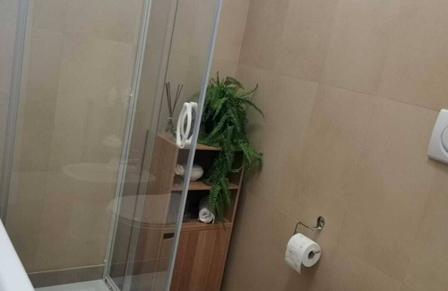 -bagno completo, con ampia doccia, asciugacapelli professionale, piastra per capelli e dotato di luce therapy.