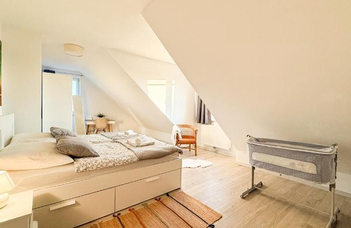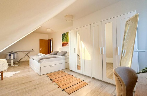 Vienna's Nature Corner - charming rooftop family apartment offers accommodations in Gerasdorf bei Wien, 7.7 miles from Austria Center Vienna and 9.1 miles from Messe Wien Exhibition and Congress Center. This apartment provides free private parking, private check-in and check-out, and free Wifi. Vienna Prater Amusement Park is 9.3 miles away and Kunst Haus Wien is 10 miles from the apartment. Providing a balcony and garden views, the spacious apartment includes 2 bedrooms, a living room, flat-screen TV, an equipped kitchen, and 1 bathroom with an a bath or shower. Towels and bed linen are provided in the apartment. For added privacy, the accommodation features a private entrance. St. Stephen's Cathedral is 11 miles from the apartment, while St. Peter's Catholic Church is 11 miles away. Vienna International Airport is 23 miles from the property.