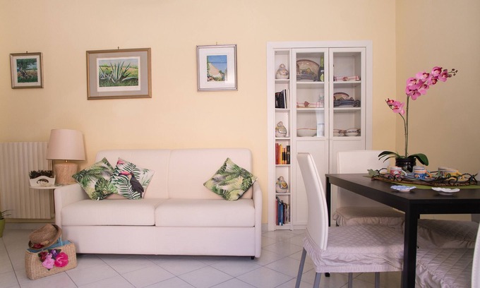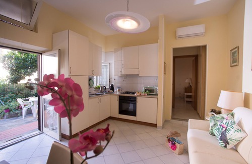 The apartment is located inside a villa in the center of Vietri, in a quiet area. The property has an independent entrance and is surrounded by a garden, part of which is reserved for guests, equipped with table, chairs and umbrella.