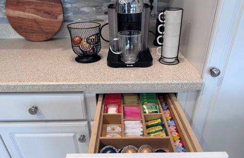 Kitchen: Large Kitchen with microwave, oven (air fryer capable)/gas stove, refrigerator with icemaker, Nespresso Coffee Machine, Toaster, Blender, Food Processor, Pantry and plenty of cabinet space. Everything you need for cooking and baking including pots, pans and large pots for crabs! We offer a variety of dishware, utensils along with spices and cooking oils