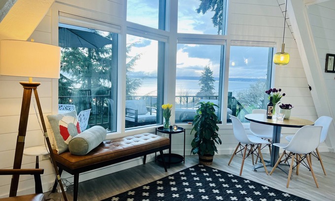 Relax and unwind at this beautiful A-frame cabin on Camano Island. This wooded property has ample patio space, a hot tub & dry sauna to enjoy serene and stunning Puget Sound views of Port Susan and Mt Baker! The house offers a mix of mid century modern and vintage furnishings, a well appointed kitchen and 2 bathrooms, with 1 queen and 1 king bedroom. Beach access with kayaks seasonally available. New EV Charger! Perfect for a couples getaway, girls trip, digital nomads, or solo retreat.