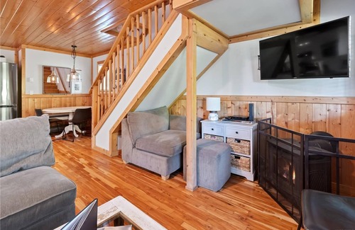 Gather around the gas fireplace or enjoy movie night on the large smart TV with streaming apps. The space is open, warm, and welcoming.